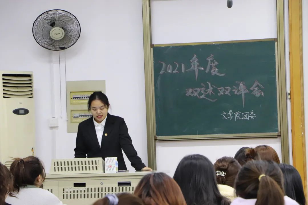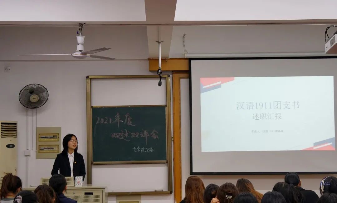 会议由各团支书按照高年级到低年级、汉语-汉师-广电-国教专业的顺序依次上台做述职报告。述职报告是团支书根据其团支部上一年的工作情况做出的总结汇报和自身特色展现,包括思想政治及学习教育工作总结、团支部荣誉展示、不足反思和未来展望等方面。这是团支书总结经验、发现不足的重要渠道之一,有助于团支书提升技能素质,充分激发其基层团支部建设动能与活力。同时也是上级团组织检验考核团支书工作,评定其工作能力的重要依据。团支书做完述职报告后,负责该团支部的团建指导员对团支书的述职报告进行点评和总结。