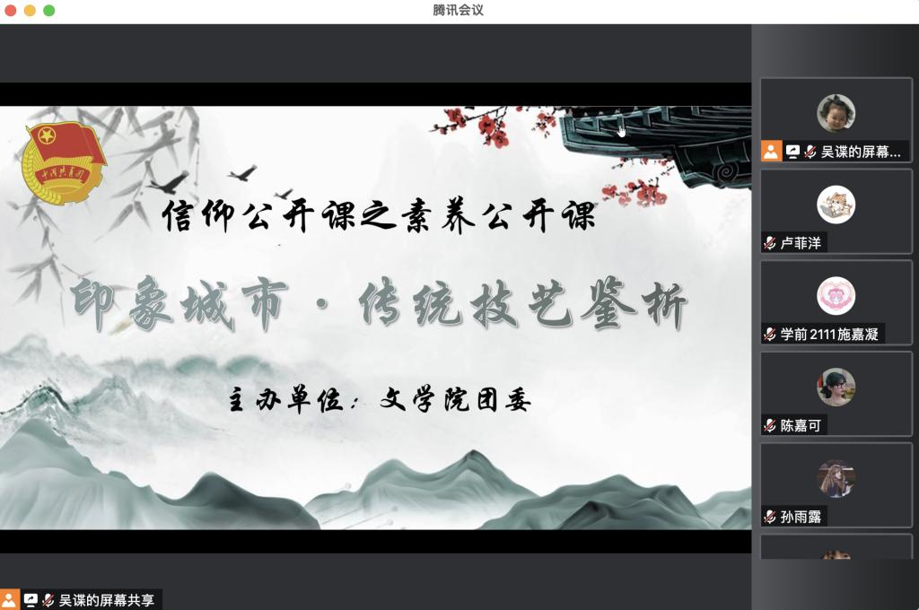为赓续传统文化,弘扬工匠精神,进一步学习贯彻党的二十大精神,培养有文化、能创新的新时代青年,欢迎光临888集团团委于11月30日通过腾讯会议举办“印象城市·传统技艺鉴析”信仰公开课。本次信仰公开课由欢迎光临888集团吴谍同学主讲,欢迎光临888集团各年级共计130余名同学参与了公开课。