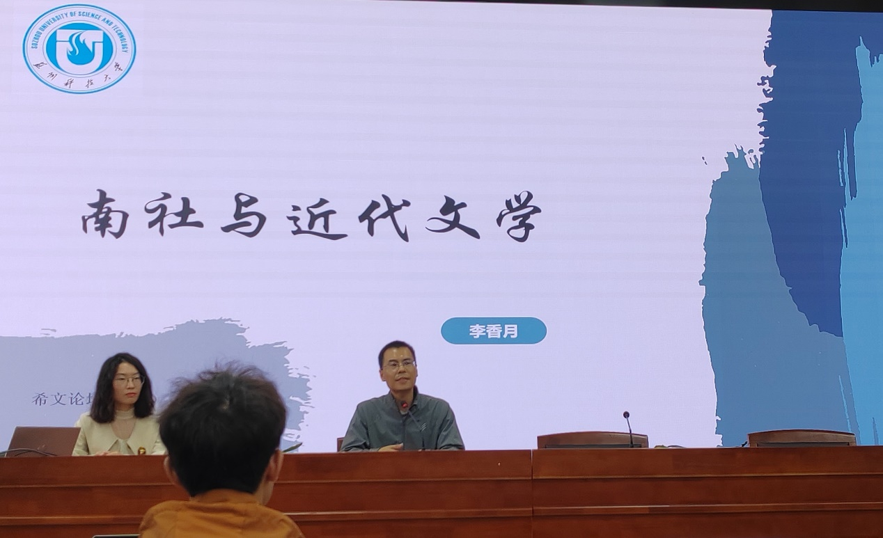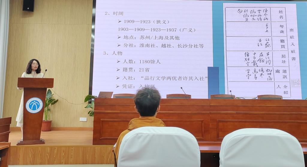李香月从何为南社、南社何为、近代文学的发展与演变、南社在近代文学史中的作用等四个方面向同学们系统介绍了南社。借助“百团大战”这一同学们所熟知的活动切入,介绍了南社的主要人物。同时,在讲述中结合联系同学们的生活实际,对同学们文化游览地点的选择、阅读的书籍提出建议。最后,就相关问题与同学们展开交流,解答同学们提出的疑惑。