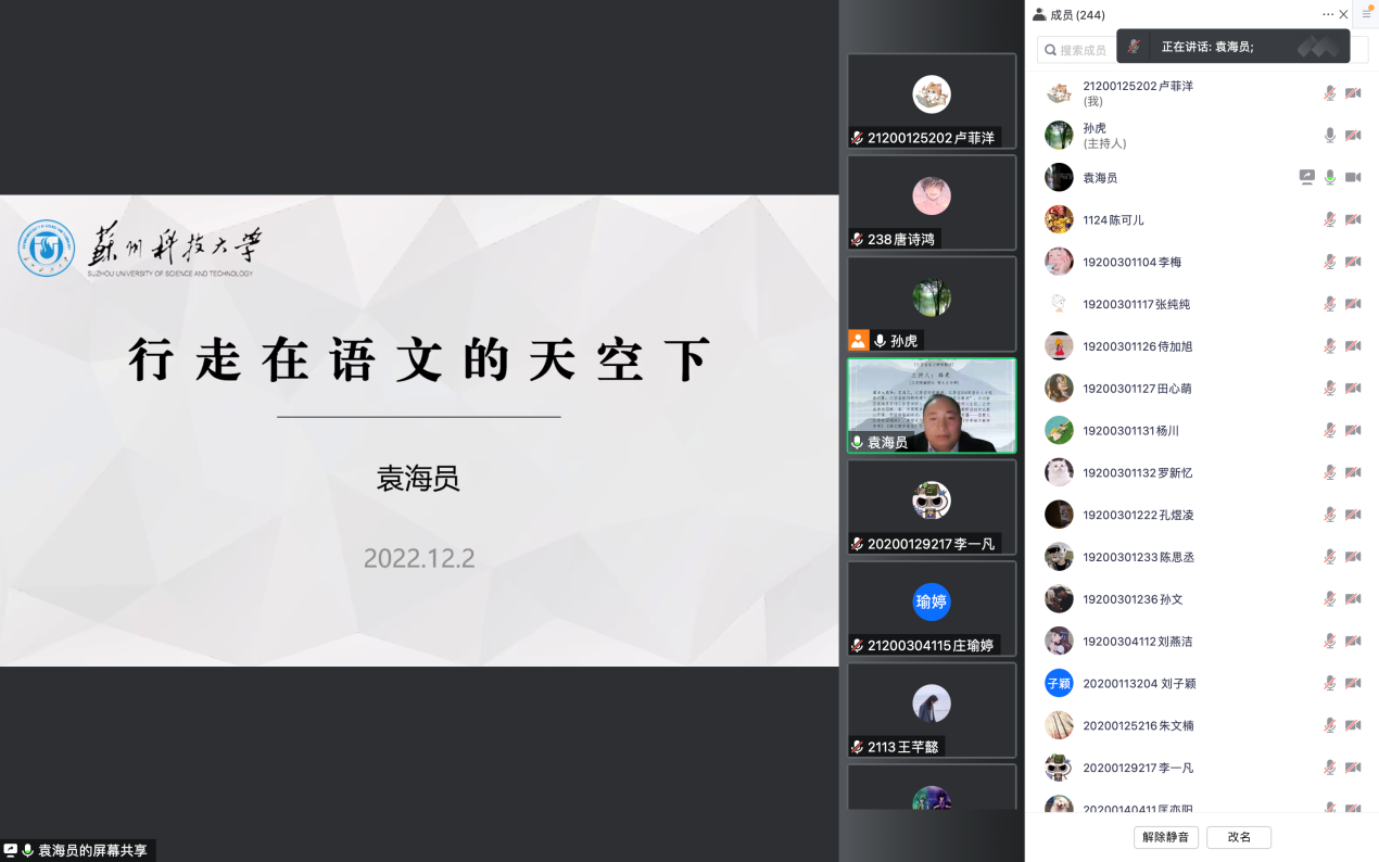 12月2日,江苏省语文特级教师袁海员为252名汉语言文学师范专业的同学带来云端讲座——《行走在语文的天空下》,讲座由欢迎光临888集团副院长孙虎主持。