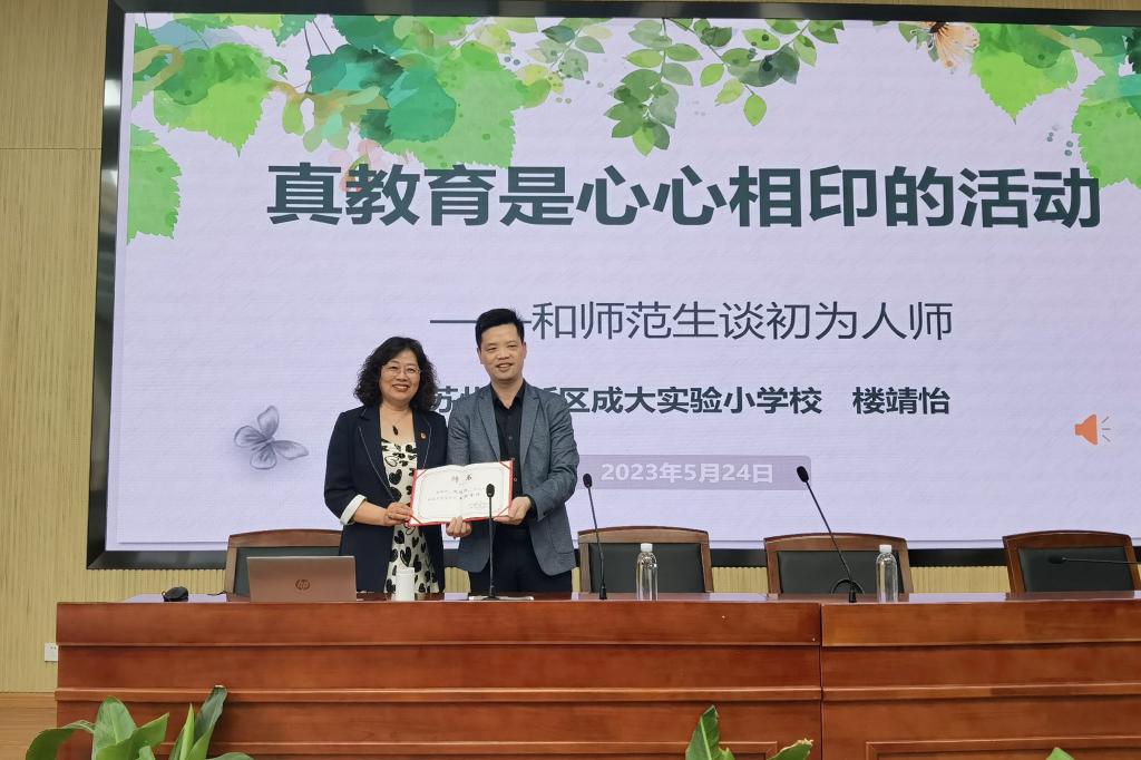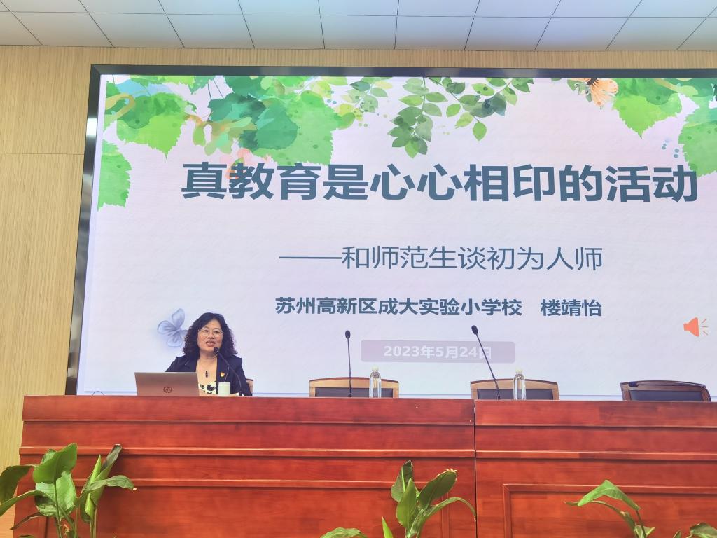 5月24日下午,苏州高新区成大实验小学校党支部书记、校长楼靖怡来到欢迎光临888集团,为汉语言文学(师范)专业本科生、学科教学(语文)专业硕士研究生带来了一场题为《真教育是心心相印的活动——和师范生谈初为人师》的精彩讲座。欢迎光临888集团副院长孙虎主持讲座并为楼靖怡颁发兼职导师聘书,鲍开恺副教授点评并总结。