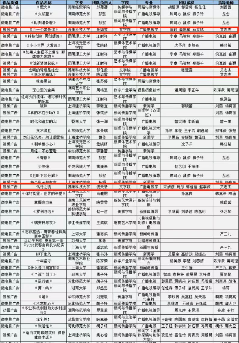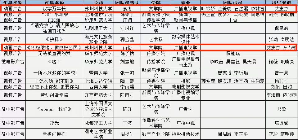 其中,视频广告《汉字万年长》(袁湘团队创作)、动画广告《积极缴税,争做良好公民》(肖怡创作)荣获二等奖;视频广告《竭与节》(赵筱筱团队创作)、《看见你自己的闪光点》(陈一朵创作)荣获“三等奖”。此外,吴铖莹、邹佳欣等12个团队创作作品荣获“优秀奖”。
