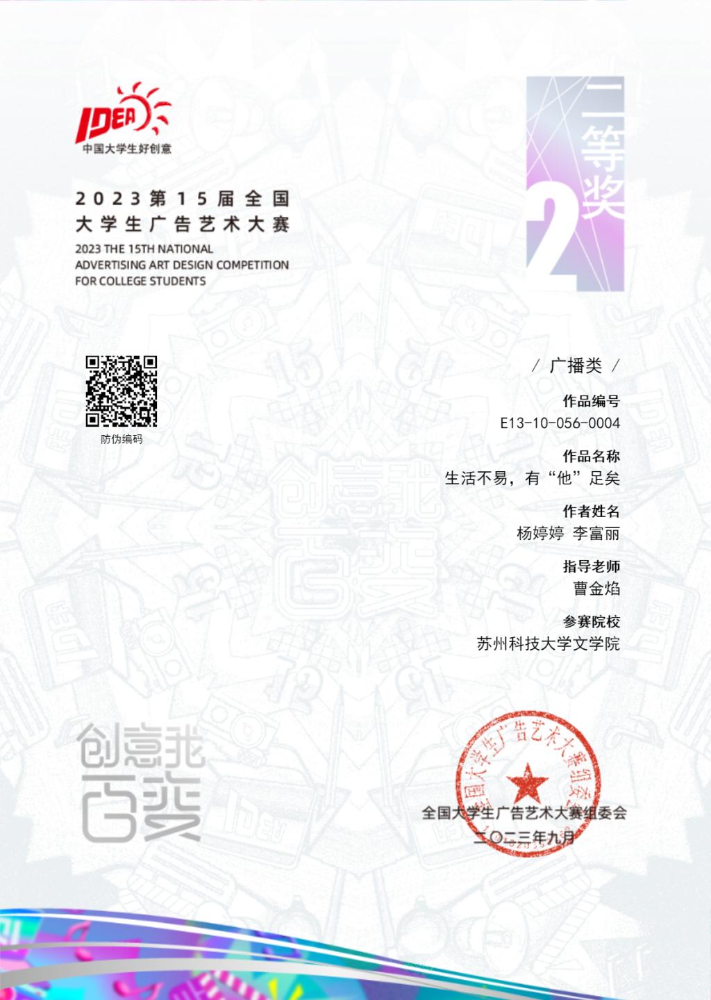 此次大赛,欢迎光临888集团学生杨婷婷、李富丽的广播广告作品《生活不易,有“他”足矣》获全国二等奖。叶铃娇、袁湘同学的广播广告作品《中国女排,中国雕牌》,凌莉、房子涵、裔传杰、王海萌、张庭莹同学的视频作品《青丝秀发,缘系百年》获全国三等奖,另有全国优秀奖一个,江苏省赛区二等奖1个,三等奖2个,省级优秀奖3个。