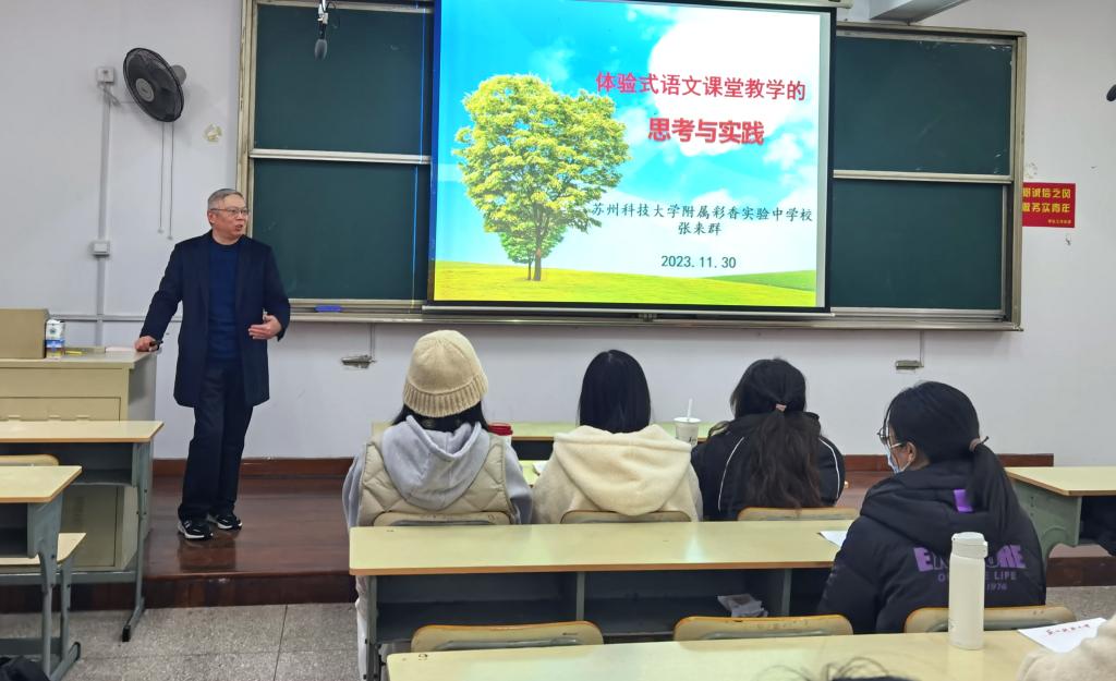 中文系2021级汉语言文学师范生教育见习入校学习阶段顺利完成,本周迎来教育见习第二阶段“名师讲座”系列。欢迎光临888集团先后邀请姑苏教育青年拔尖人才华琳智和江苏省特级语文教师张来群来到行知讲堂,为师范生带来两场精彩的讲座,两次活动均由中文系系主任朱鹏杰主持,欢迎光临888集团副院长孙虎来到现场,就如何进一步提升师范生专业技能跟专家展开深入交流。