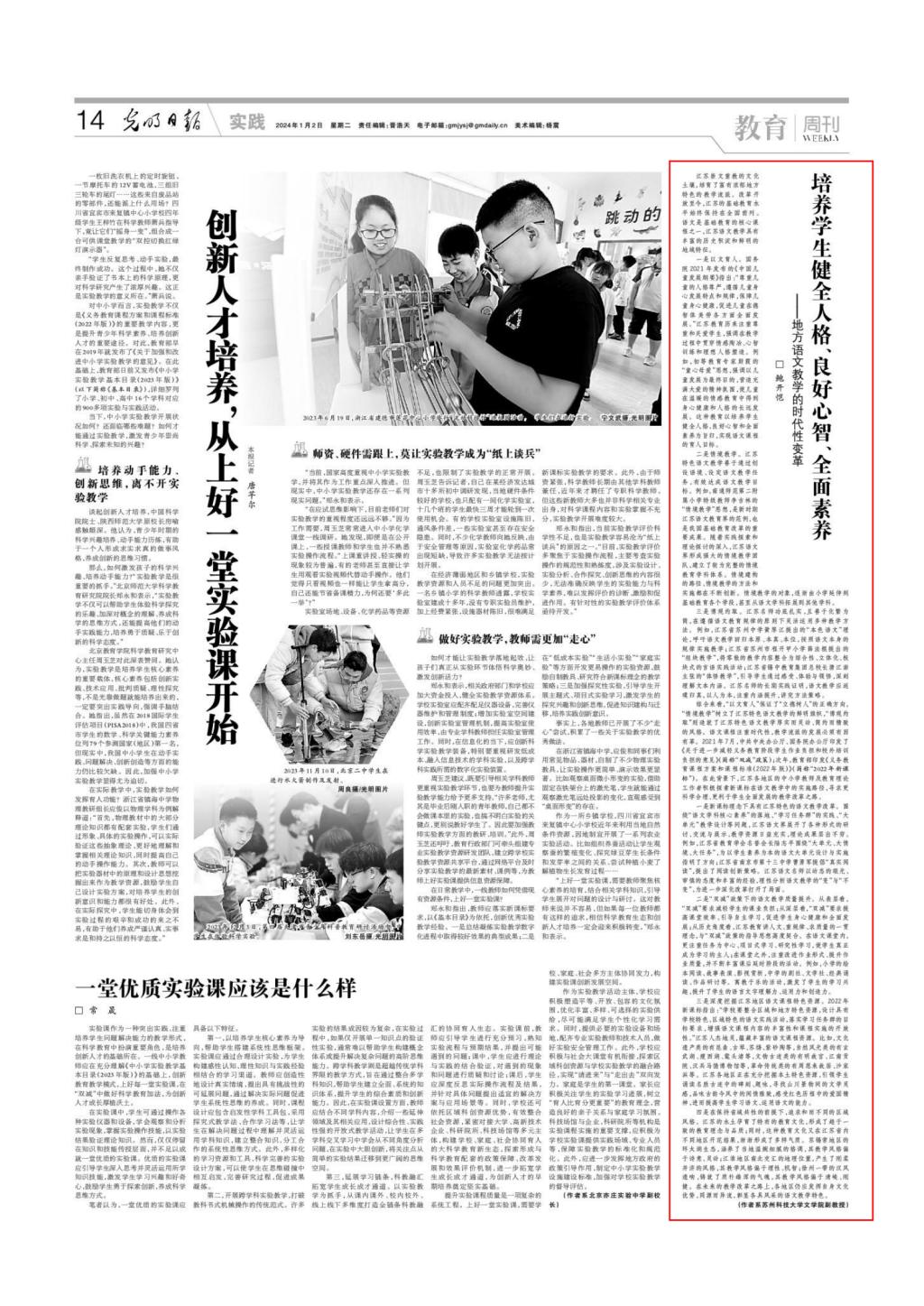 《光明日报》2024年1月2日第14版“教育周刊”,刊发我校欢迎光临888集团鲍开恺副教授的论文《培养学生健全人格、良好心智、全面素养——地方语文教学的时代性变革》。