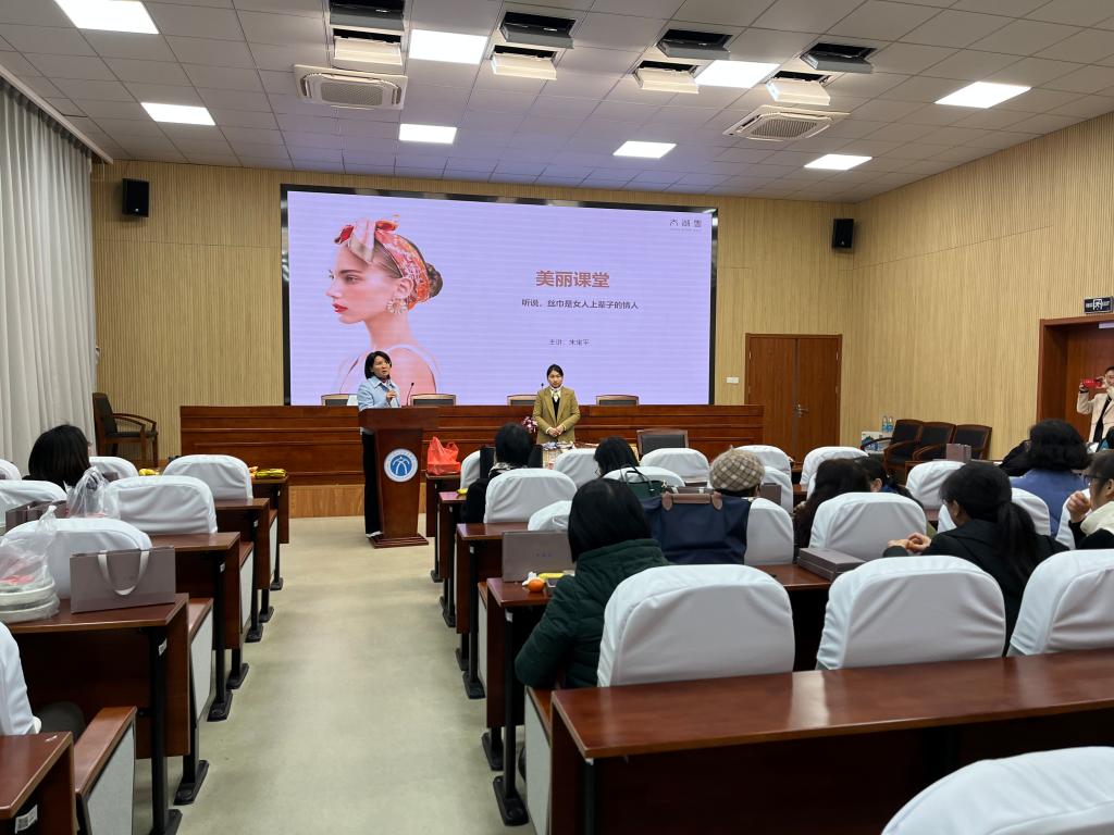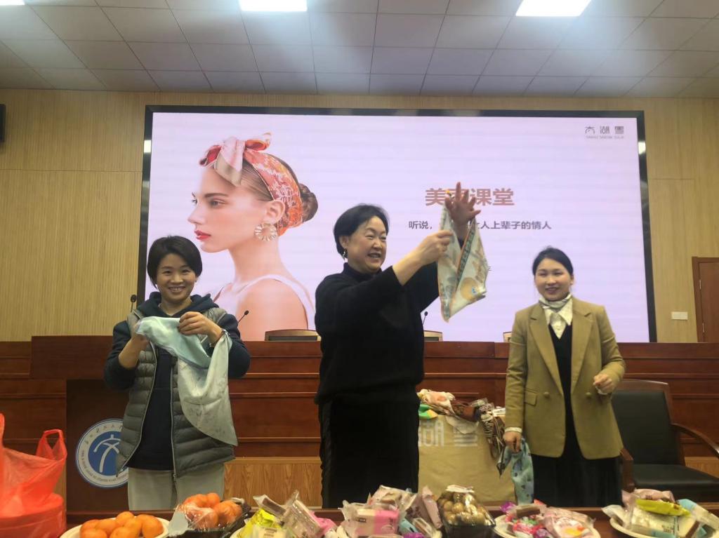 在专业老师的鼓励下,大家主动上台展示自己独创的丝巾系法,共同交流丝巾的保养方法,如冷水手洗,阴凉处晾干等小妙招。活动现场欢声笑语,洋溢着节日的气氛。