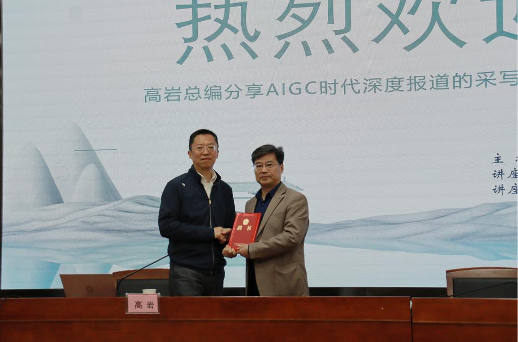 在讲座开始前,凌郁之为高岩颁发聘书,聘任高岩为我院兼职教授。聘任仪式完成后,高岩为广电学子带来了苏州日报出版的《深度118》,并向学生代表赠书,表达了高岩对我院学子的殷切期望和美好祝愿。