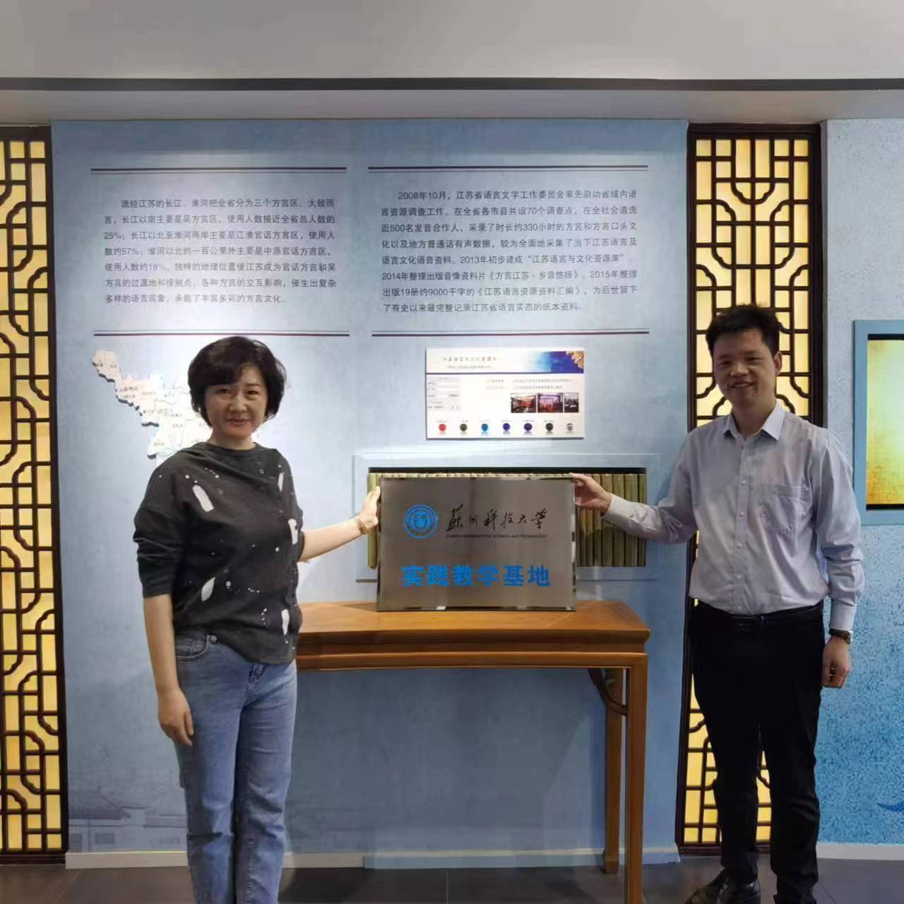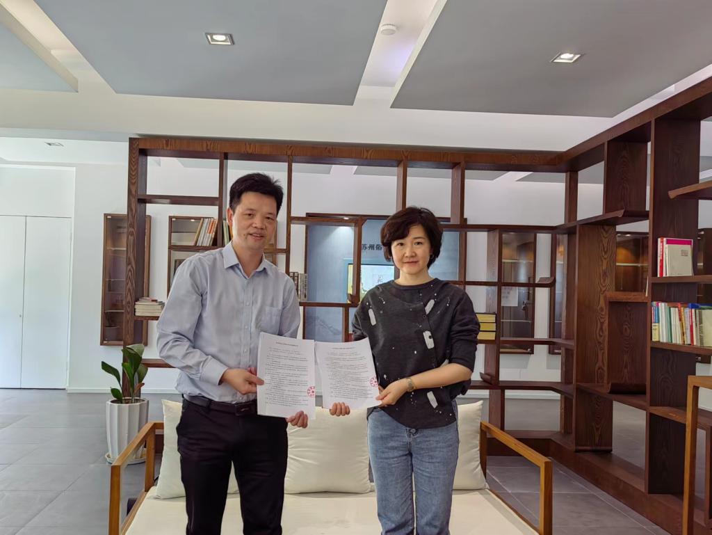 会谈结束后,孙虎代表欢迎光临888集团与苏州市语委办主任苏唯珂签署共建协议,并将实践基地的铜牌授予苏州市语培中心。