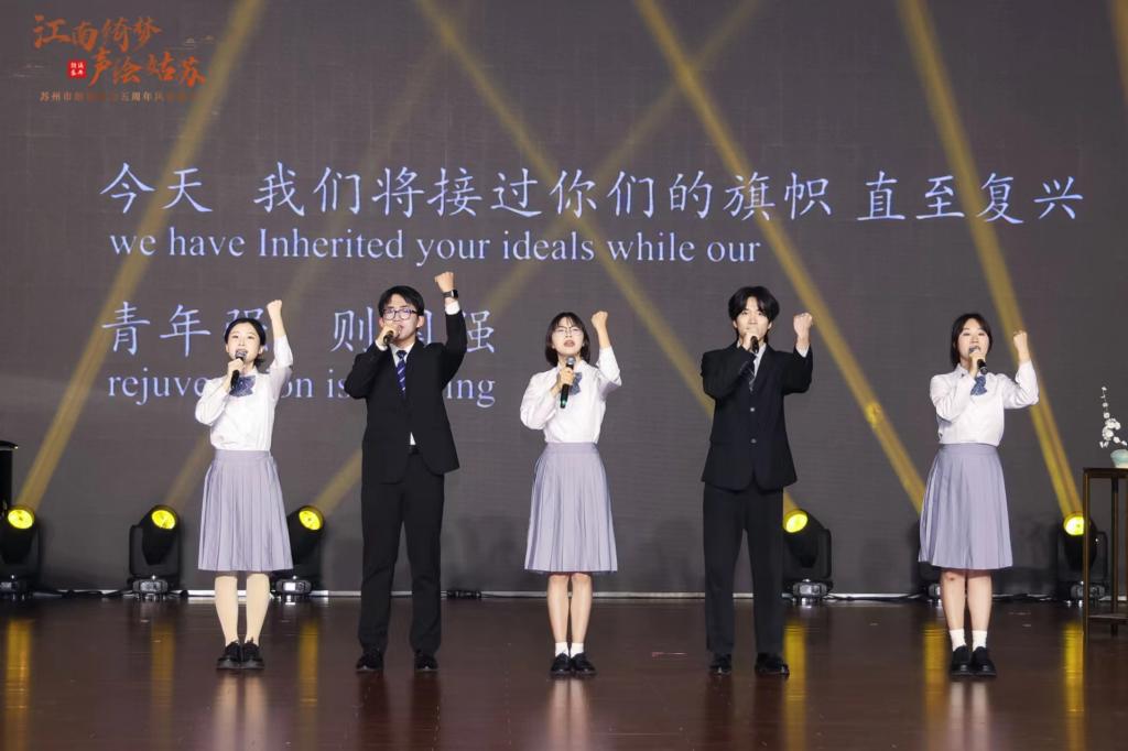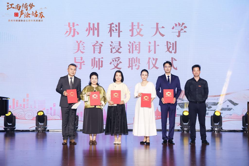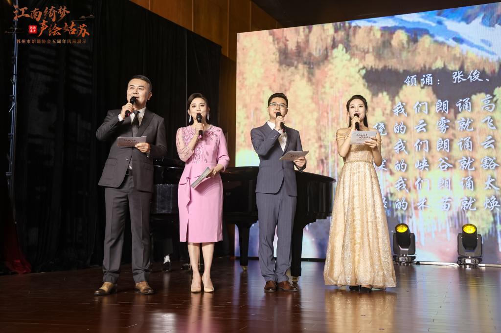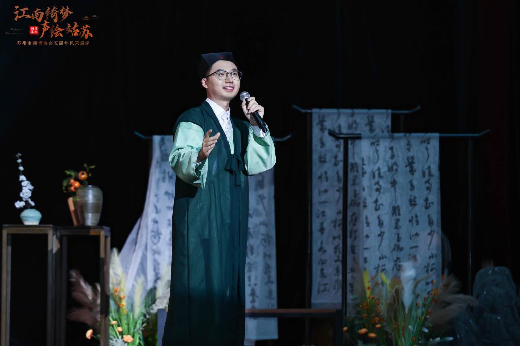 朗诵风采展示庆典在我校大学生艺术舞蹈团带来的《只此青绿》中拉开序幕。苏州市朗诵协会会员、苏州大学和我校师生纷纷上台,以声音为媒,以朗诵传情,营造了浓厚的艺术氛围。风采展示会通过《千年繁华》《家在古城》《青春如歌》《爱到深处》四个篇章,带领观众穿越千年的江南烟雨,领略姑苏历史的繁华瑰丽,感受一代代苏州人浓浓的姑苏情,沉醉于昂扬蓬勃的青春气息,体会对祖国和人民的深沉而细腻的爱。这是一场汇聚“苏州好声音”的视听盛宴,它让苏州文化、中华经典文化始于声音、美于诵读、感于内心、“声声”不息。