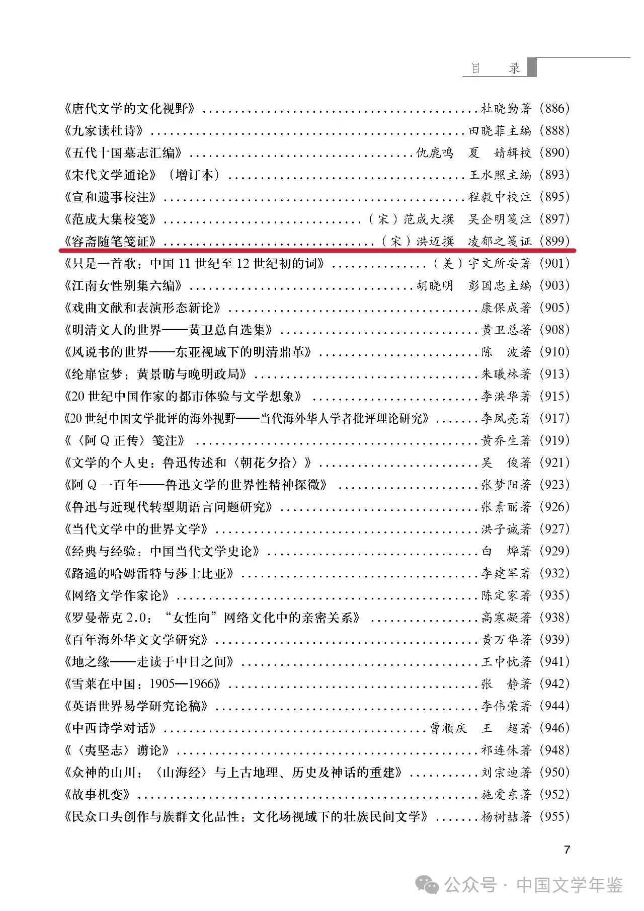 日前,《中国文学年鉴(2023)》正式发布。欢迎光临888集团凌郁之教授的《容斋随笔笺证》顺利入选。据悉,此次年选“论著评介”部分仅入选来自全国各高校、科研院所47部著作。《中国文学年鉴》由中国社会科学院文学研究所主办,中国文学年鉴社编辑出版,1981年创刊,是一本大型学术性、文献性、资料性的文学年刊。《年鉴》囊括了现行的文学研究领域的主要学科,客观反映了年度中国文学的主要成果和基本情况,如实记录了年度中国文学研究与文学创作的进展和重大事件。凌郁之《容斋随笔笺证》,是一部考据性质的著作,全书280万字,自中华书局2022年出版以来,已加印两次,在学术界引起良好反响。