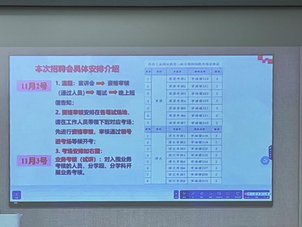 本次招聘包括网上报名、集中宣讲、材料审核、笔试、业务考核(试讲)、择优选岗、办理拟录用手续等流程。招聘会现场,苏州工业园区教育局工作人员向前来应聘的毕业生介绍了园区教育的发展现状以及园区教育现代化、国际化、均衡化、特色化的特点,并详细解读了苏州工业园区人才引进政策、用人单位的基本概况、专业教师的招聘计划以及选聘流程。招聘会现场毕业生主动与用人单位沟通交流,详细询问岗位要求、职业发展、笔试面试考察重点等相关问题,并积极投递简历。