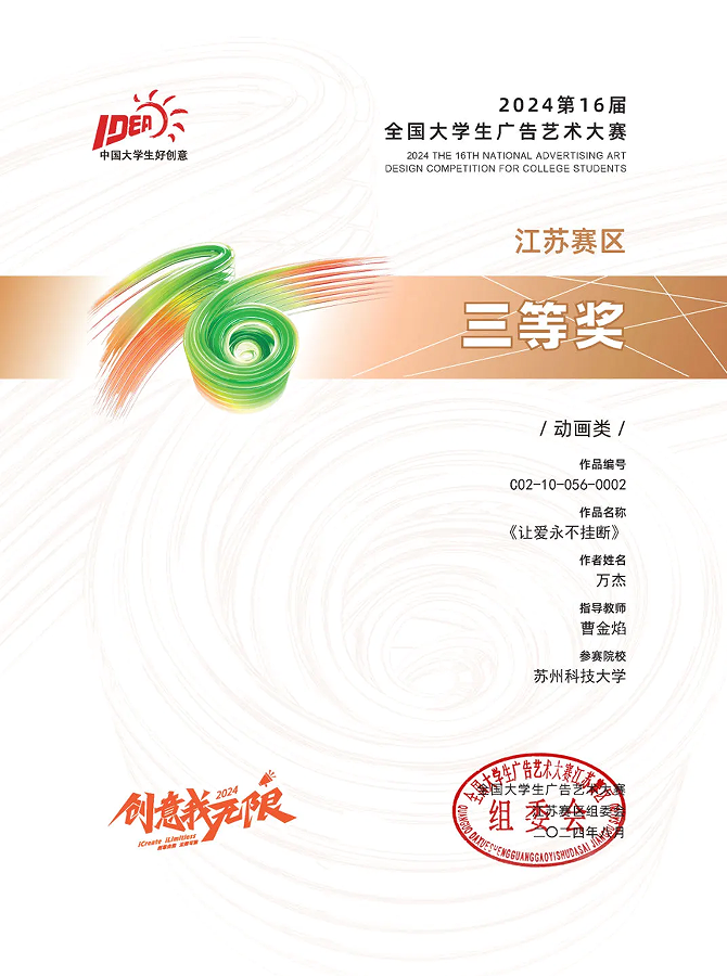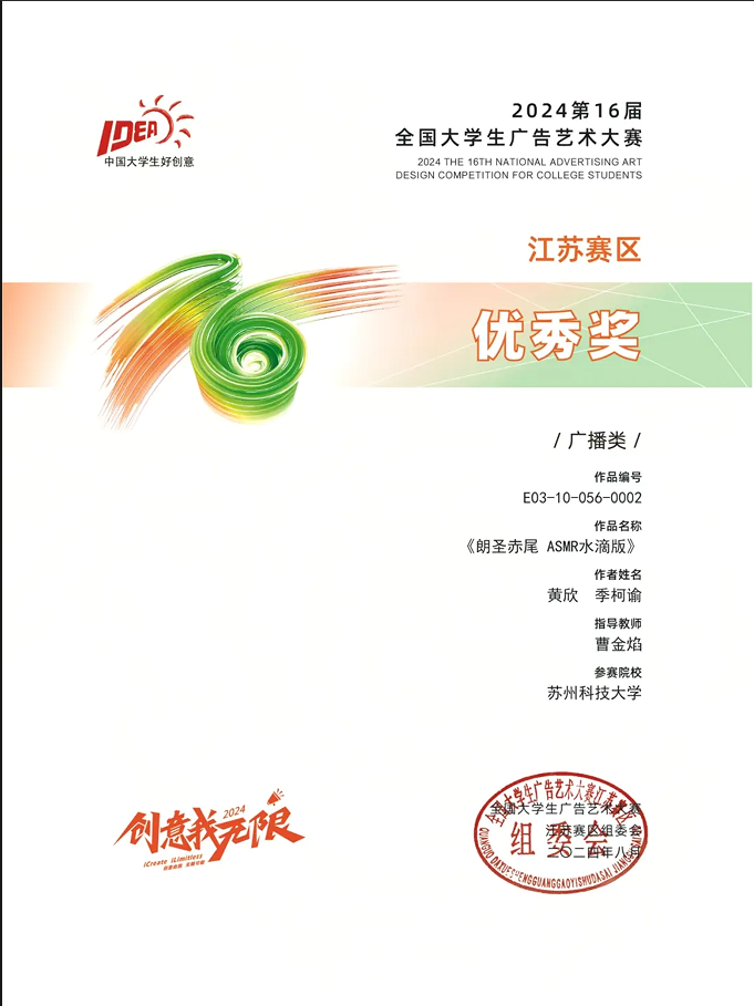 欢迎光临888集团广电系学子在第16届全国大学生广告艺术大赛中斩获佳绩,在广电系曹金焰老师的指导下,宋妍彦、王溢萱、刘迎迎团队获营销创客类全国三等奖。万杰同学的动画类作品《让爱永不挂断》获江苏赛区三等奖。黄欣、季柯谕同学的广播类作品《朗圣赤尾ASMR水滴版》获江苏赛区优秀奖。