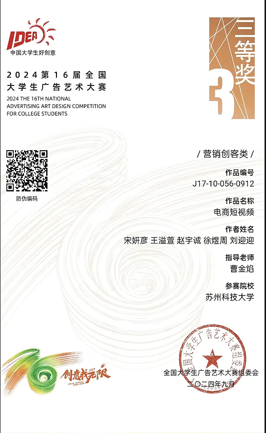 第16届全国大学生广告艺术大赛由教育部高等教育司指导,教育部高等学校新闻传播学类专业教学指导委员会、中国高等教育学会广告教育专业委员会共同主办,是国内规模最大、覆盖高等院校最广、参与师生人数最多、具有较大社会影响力的全国性高校学科竞赛。其中新赛道营销创客类(电商短视频、网络直播)竞赛汇聚了全国186所高校精英团队,参与师生总计6000余人,共报送了1856组作品。电商短视频作品以及网络直播形式的比赛,充分彰显当代大学生参与全球化信息时代的蓬勃活力与无限潜能。