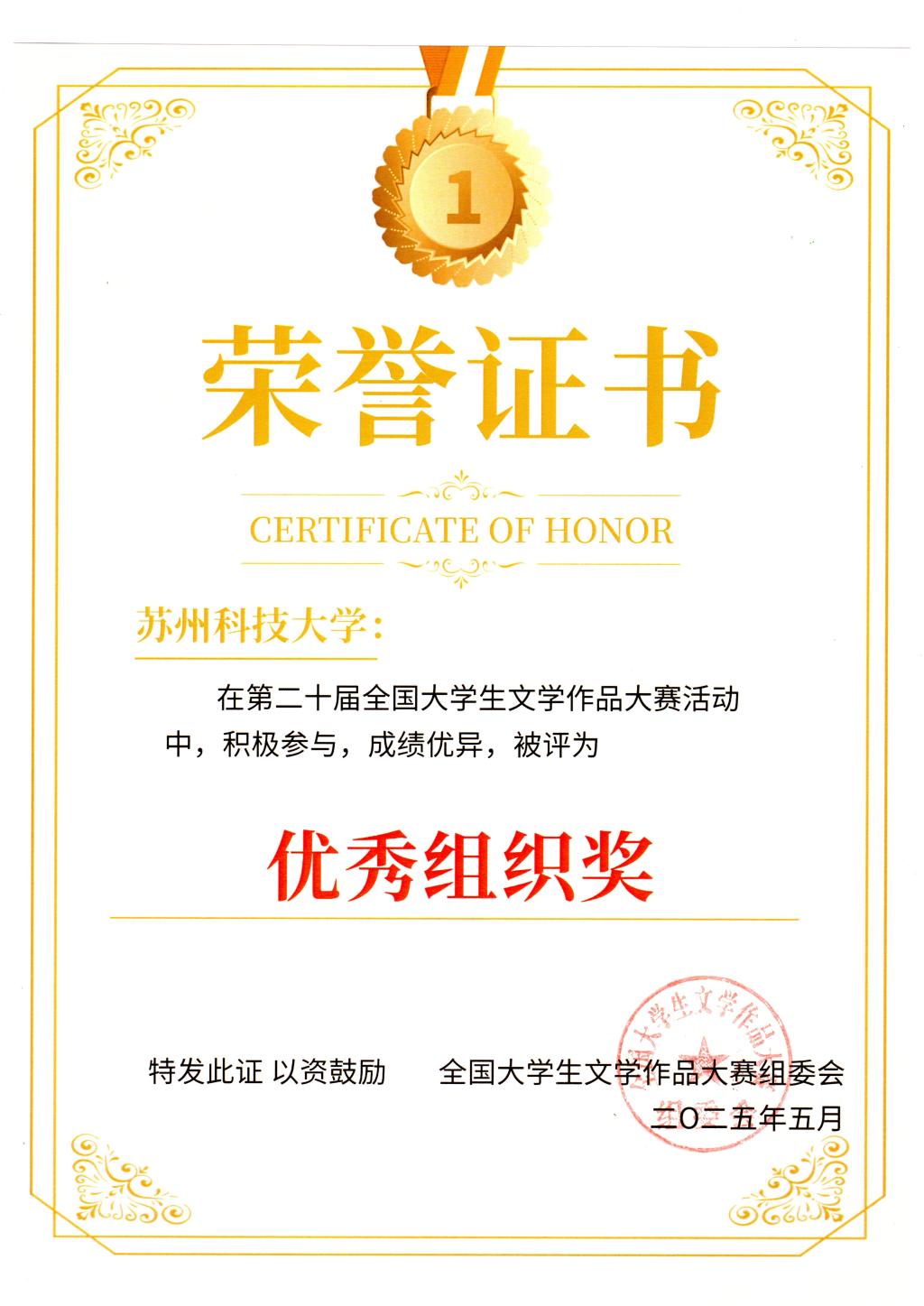第二十届全国大学生文学作品大赛由中国诗歌学会、湖北散文学会主办。我校参赛学生93人获奖,其中一等奖6人、二等奖22人、三等奖65人,我校获得这项赛事的优秀组织奖。