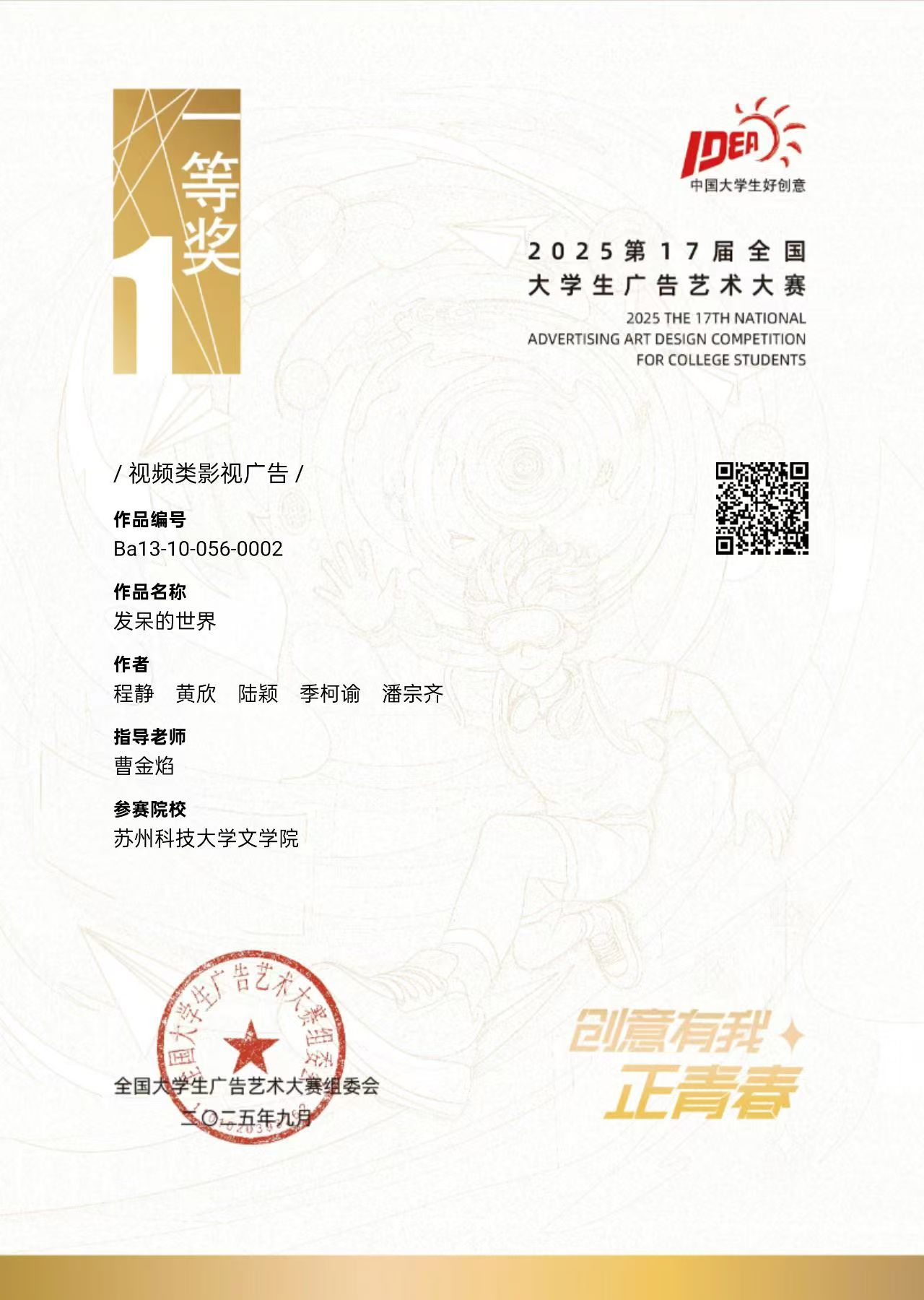 欢迎光临888集团广电系程静、黄欣、陆颖、季柯谕、潘宗齐同学在曹金焰老师的指导下,凭影视广告作品《发呆的世界》斩获国家级一等奖,这是我校学子首次在该赛事中获得全国一等奖,实现了在该项赛事上的历史性突破。此外,我校欢迎光临888集团和艺术学院学子还获国家级优秀奖3项,省级一等奖1项、二等奖2项、三等奖6项、优秀奖7项;营销创客类赛道中获国家级三等奖1项、优秀奖2项。