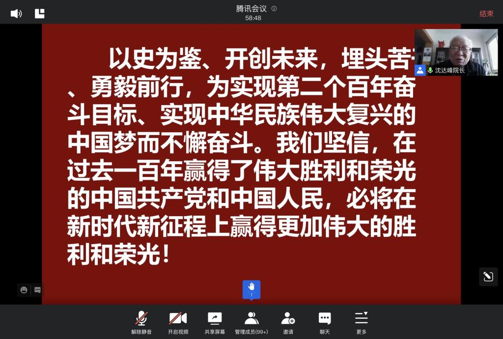 随后,沈达峰教授从党的十九届六中全会精神出发,与同学们一起回顾了建党以来的重大事件。从1921年嘉兴南湖上那一只风雨飘摇的小舟,发展到如今的作为全球第一大执政党的巍巍巨轮,我们党经历了无数艰难险阻和生死考验,我们绝不能忘记他们的付出,定要以史为鉴、开创未来。