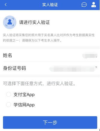 考生首次登录系统,或每次进入考场之前均需要进行实人验证。系统提供支付宝App和学信网App两种验证方式。