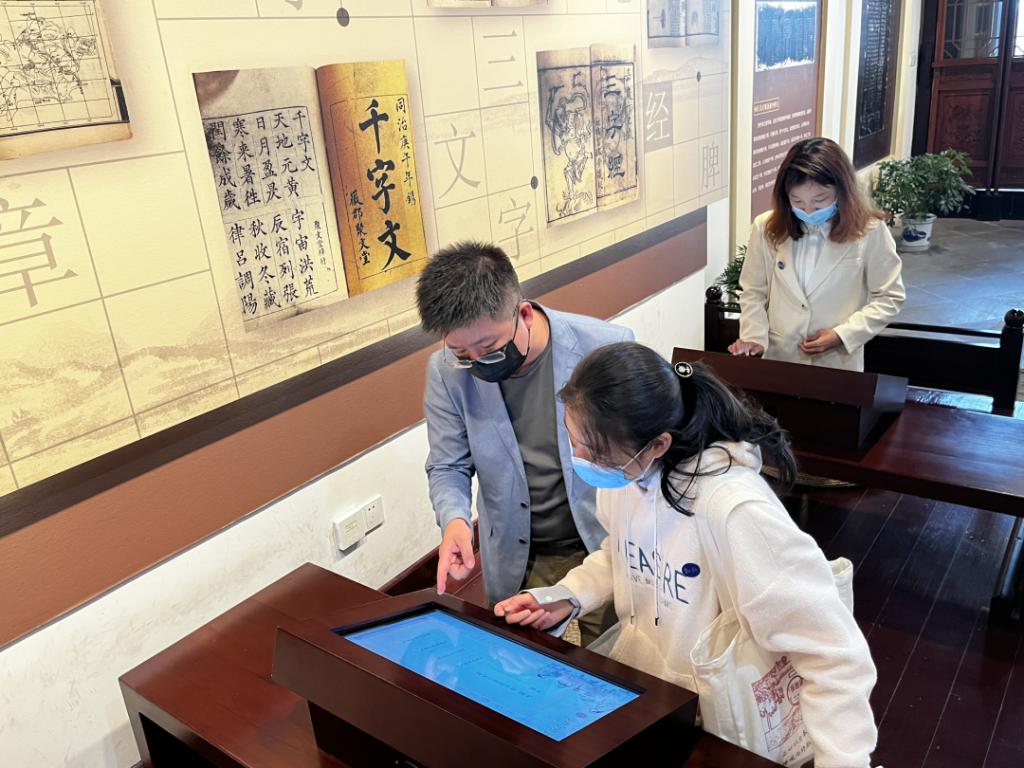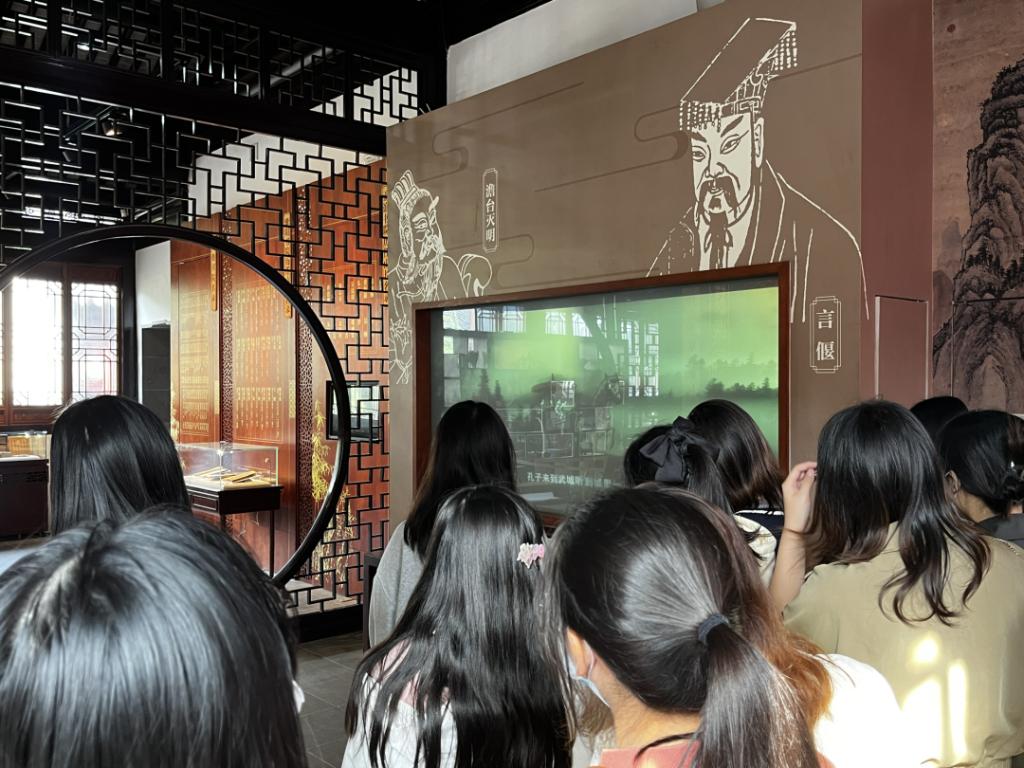 古代馆则向同学们展示了苏州教育的发展历程。彼时苏州,官学、私学相生相荣,汇聚成绵延不绝的姑苏千年文脉,一幅动态的《姑苏繁华图》便向同学们生动再现了清朝时期苏州教育的盛况。在古代馆的互动展厅,刘老师与同学们一同玩起了对对子小游戏,体会了一回古代学子的中举历程。