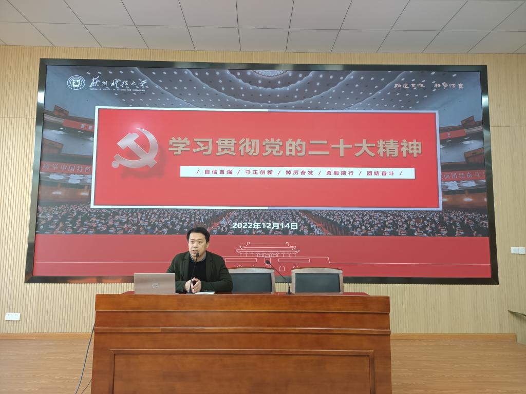 丛春秋分别从党的二十大的主题和主要成果、二十大报告要览、学习体会和工作体思三个方面对党的二十大精神进行了全面解读,他围绕过去五年的工作和新时代十年的伟大变革、马克思主义的中国化时代化、中国式现代化、全面建设社会主义现代化国家的目标任务、坚持党的全面领导和全面从严治党、应对风险挑战等关键点一一展开,深刻阐述了新时代十年的伟大变革,马克思主义基本原理同中国具体实际相结合的理论创新,中国式现代化的本质要求,全面推进党的自我净化自我革新的清醒与坚定等党的二十大报告的主要精神和习近平新时代中国特色社会主义思想的基本要义。丛春秋结合实际工作,号召大家时刻铭记五个牢牢把握,七个聚焦,将学习贯彻党的二十大精神与学校第四次党代会精神结合起来,抓好思想建设、队伍建设,以高质量党建推进学校、学院高质量发展。