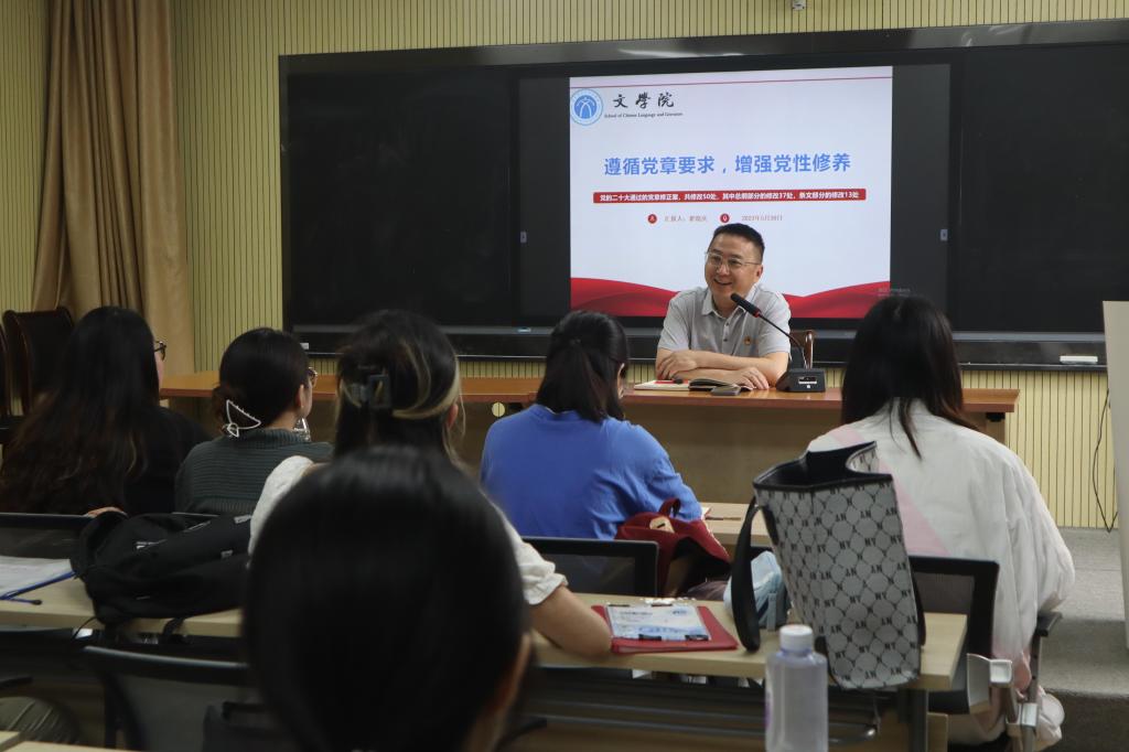 瞿晓庆以“遵循党章要求 加强党性修养”为主题开展学习贯彻习近平新时代中国特色社会主义思想主题教育,带领全体毕业生党员深入学习党的二十大通过的党章修正案。瞿晓庆结合党章发展的历史,强调学生党员要将党章精神内化于心,外化于行,发扬斗争精神,增强斗争本领。通过深入学习党章精神,毕业生党员进一步加强了自身党性修养。瞿晓庆结合毕业生党员自身专业所学本领,对各位毕业生党员提出要求和希望,强调充分发挥党员先锋模范作用,无愧使命担当,为实现中国梦不懈奋斗。