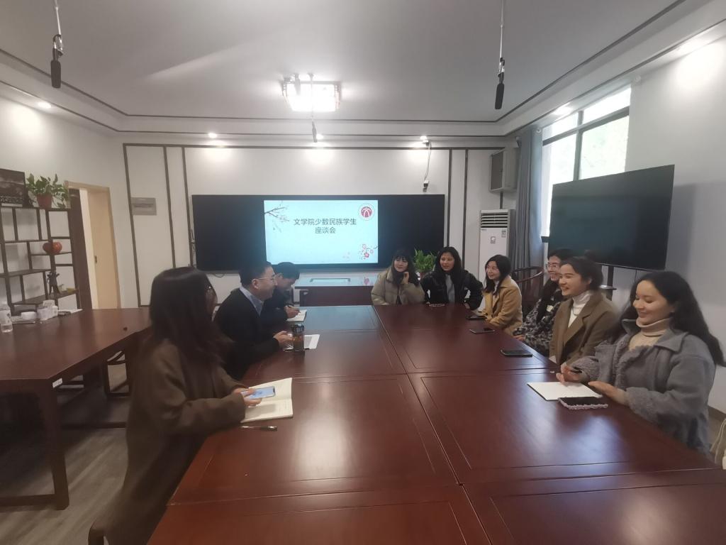 瞿晓庆与学生亲切地交谈,鼓励少数民族同学养成良好的学习习惯,在大学的不同阶段要做好专业、学习和职业规划。少数民族学生们也踊跃发言,他们畅谈了在校学习期间学习生活的感受;分享了各自民族的风土人情、文化特色;讲述了学校和学院对少数民族学生的支持和帮助。会上,少数民族同学也提出了自己在英语等学习中遇到的实际困难。与会老师也从确立目标、积极寻求帮助、参加一帮一活动等方面为同学们答疑解惑。瞿晓庆鼓励大家志存高远,增进“四个认同”,为铸牢中华民族共同体意识作出青年应有的贡献。
