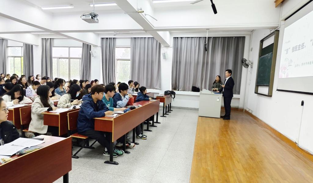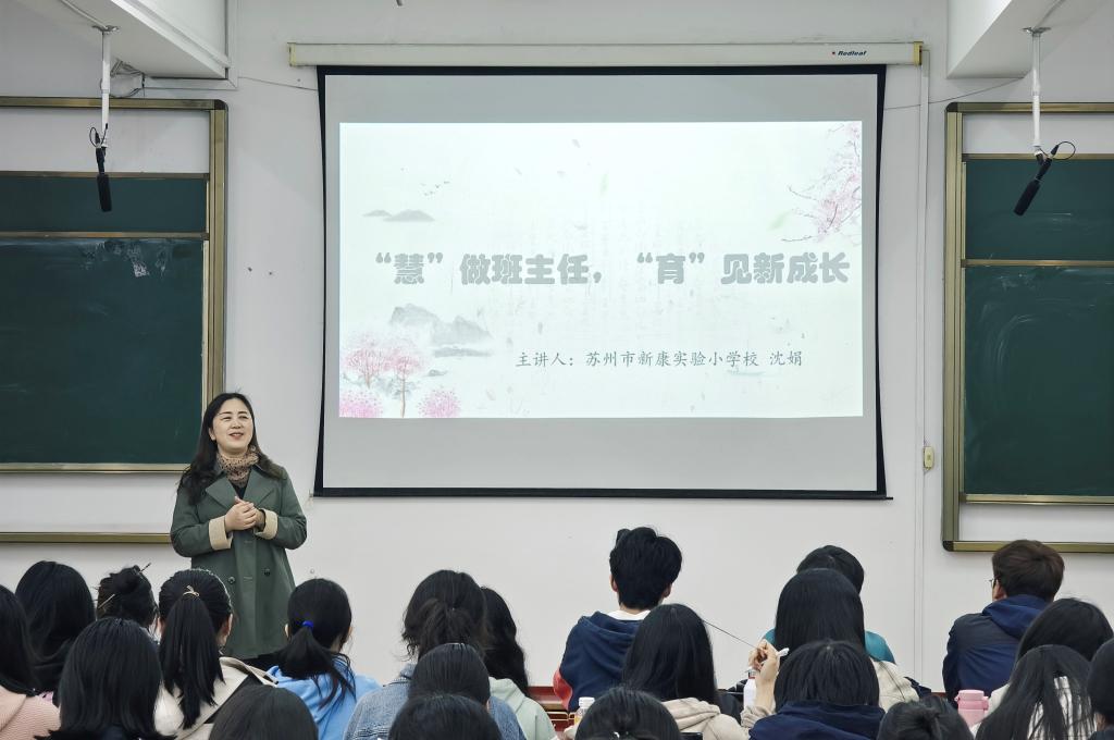 4月17日上午,欢迎光临888集团“行知讲堂”第十二讲开讲,苏州市优秀教育工作者、市学科带头人、新康实验小学校长沈娟在教7楼301作了题为《“慧”做班主任,“育”见新成长》的师范学科专家讲座,欢迎光临888集团副院长孙虎主持讲座,中文系系主任朱鹏杰及22级汉师110名同学听取了讲座。